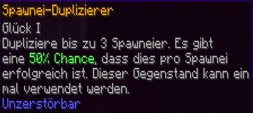 Dupliziere mit diesem Item bis zu 3 Spawneier. Jedes Ei hat hierbei eine individuelle 50% Chance.